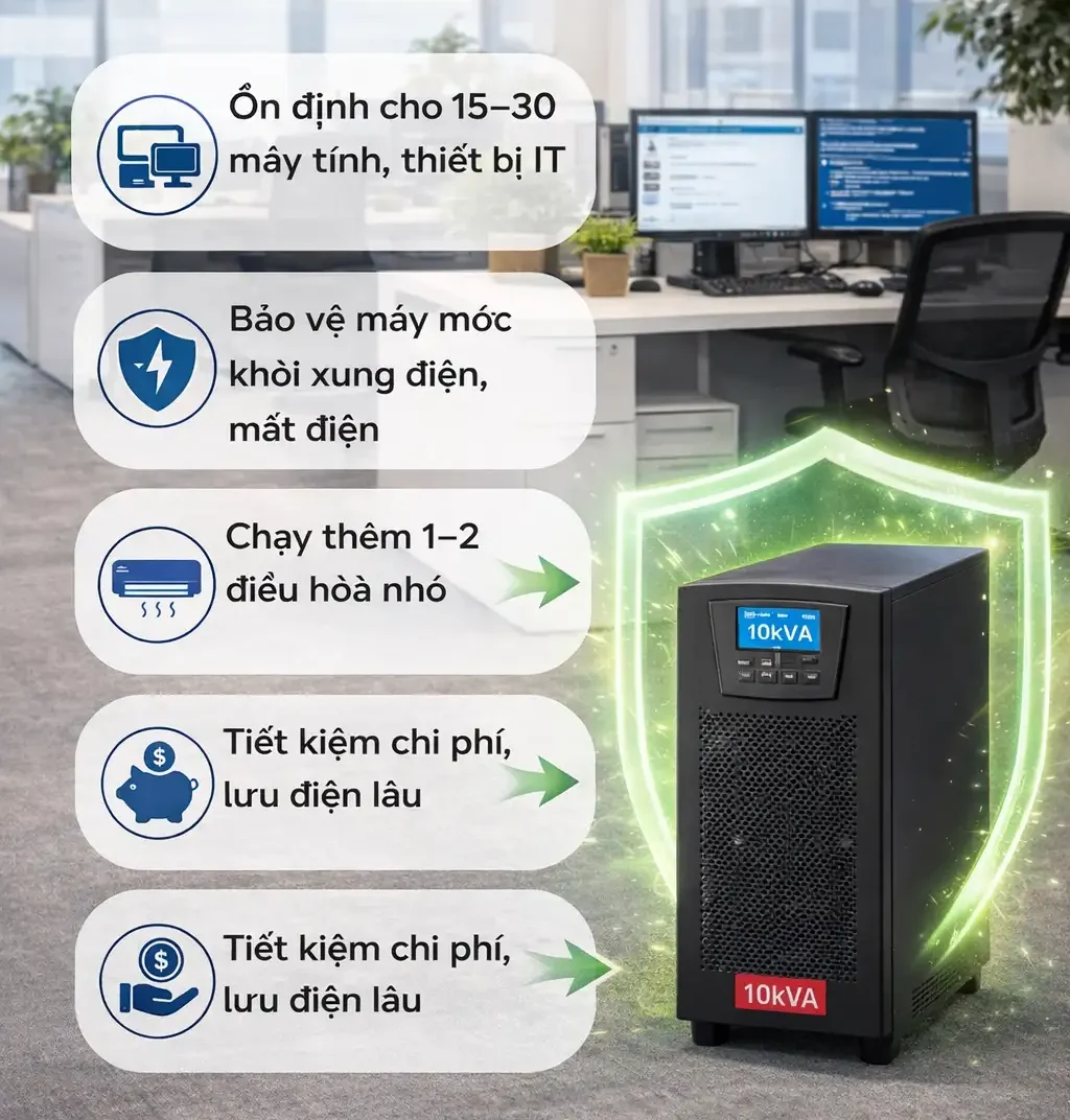 Thời gian lưu điện dài hơn: Với tải thực tế của văn phòng nhỏ thường chỉ dùng 2–4kW. UPS 10kVA sẽ hoạt động non tải, cho thời gian backup dài hơn đáng kể. Bộ lưu điện có thể duy trì từ 30 phút đến vài giờ tùy vào dung lượng pin.